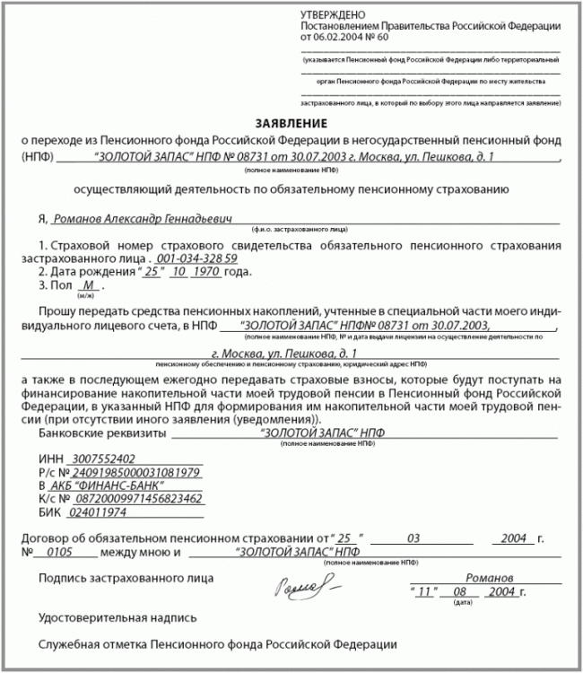 - наименование отделения Пенсионного фонда РФ (куда будет подано заявление);